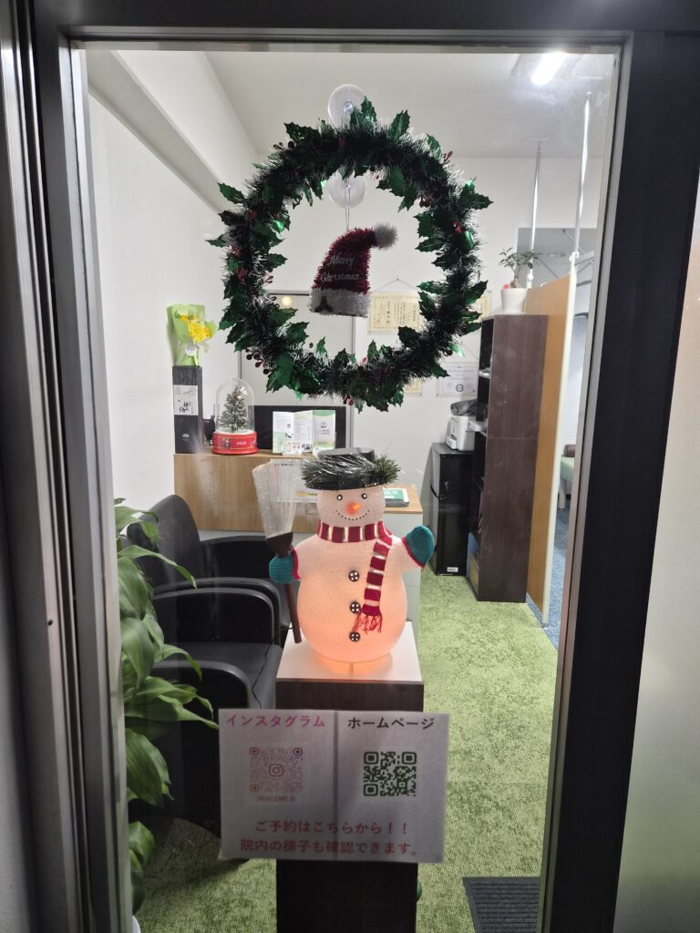 入口では雪だるまのオブジェが明るくお出迎えし、院内にはクリスマスリースを設置して、あたたかみのある空間づくりを心がけています。